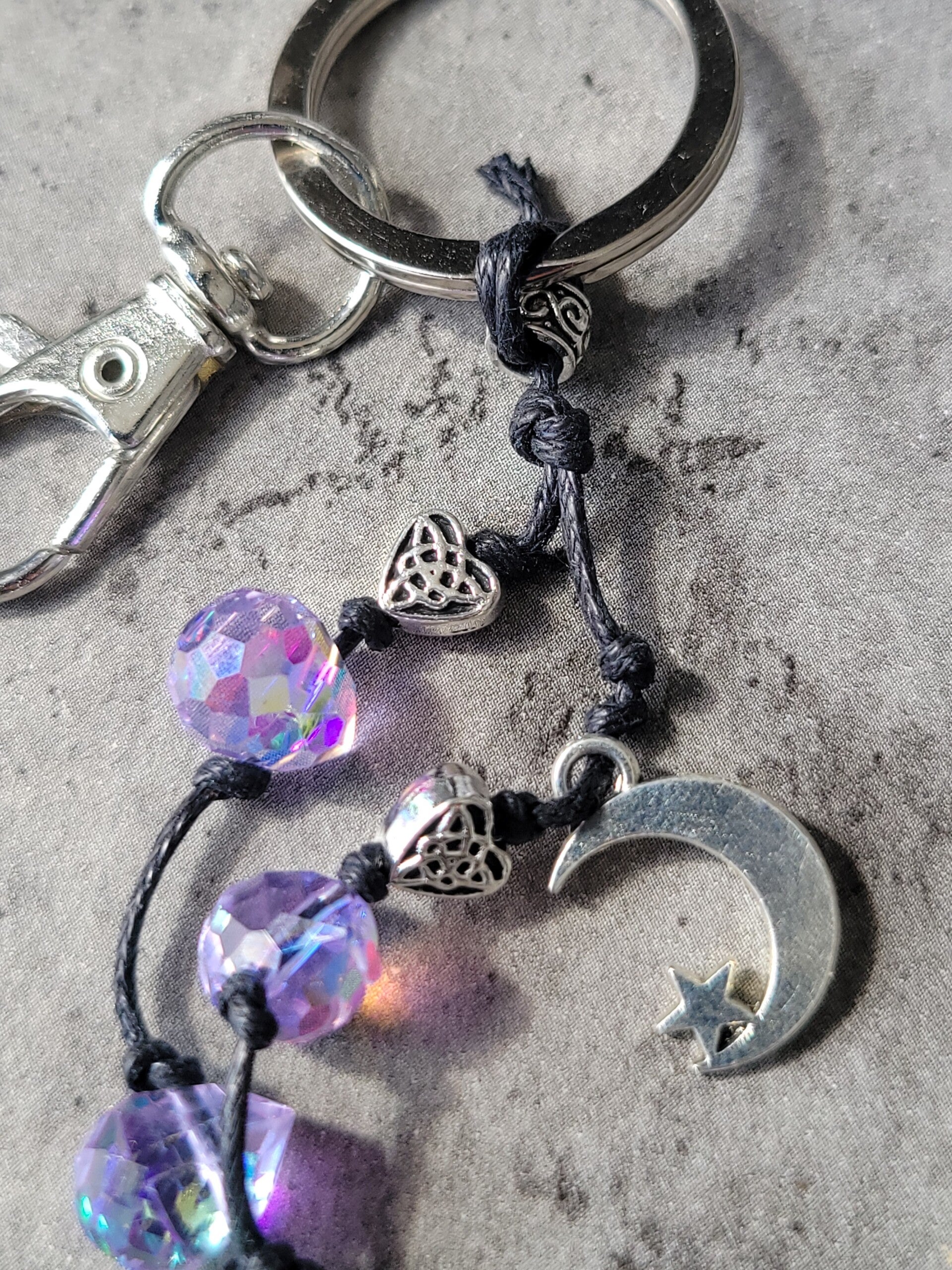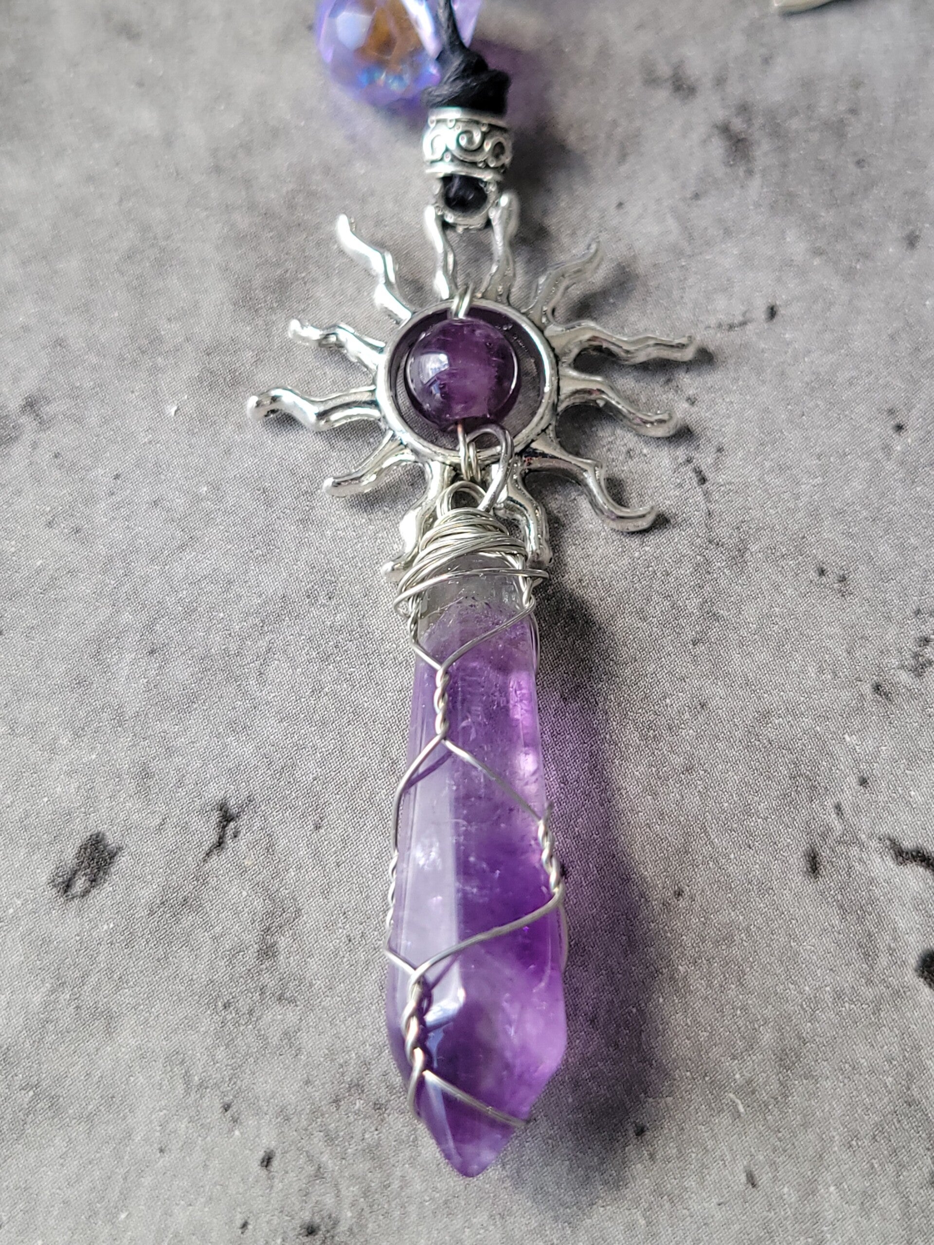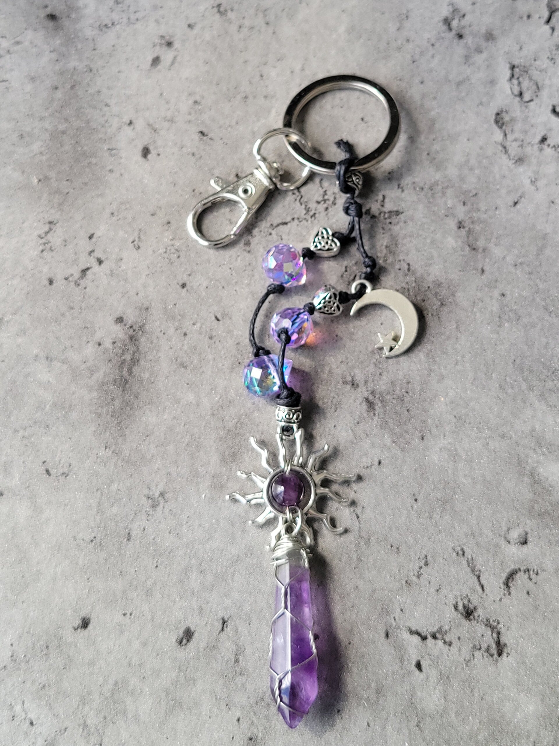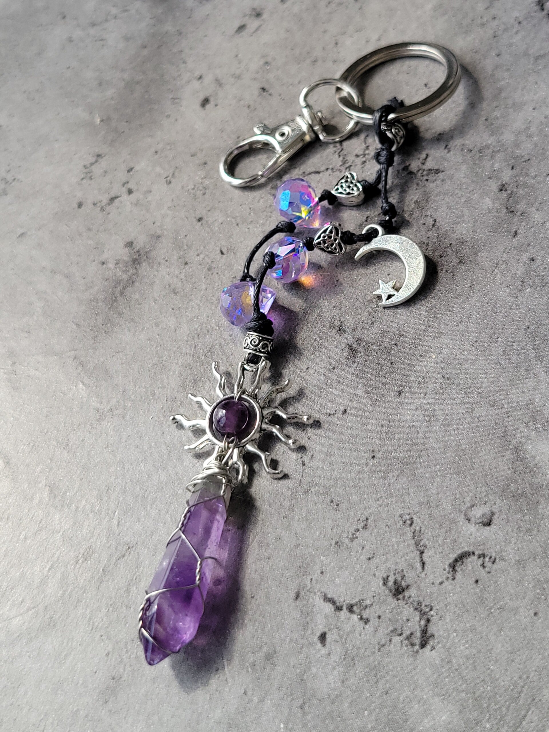 Handmade amethyst crystal keychain featuring a wire-wrapped amethyst point, celestial sun charm, crescent moon accent, and iridescent purple glass beads and lobster clasp.