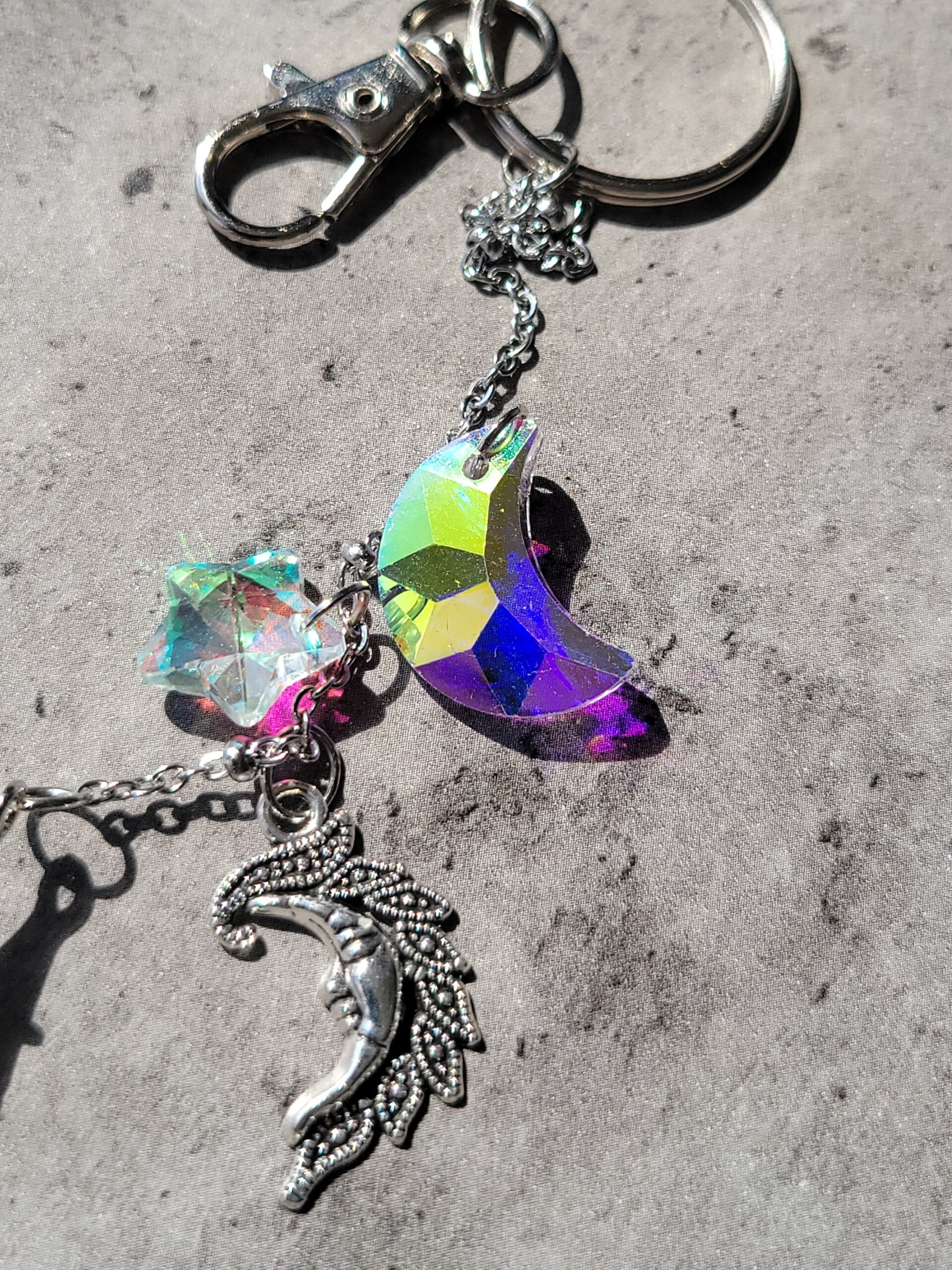 Approximately 6 inches in lengthHandcrafted keychain featuring iridescent star and crescent moon charms that shimmer with rainbow tones, paired with a detailed dolphin pendant for a playful, ocean-inspired touch. Finished with a sturdy chain, lobster clasp, and key ring for easy attachment to your keys, purse, or bag.