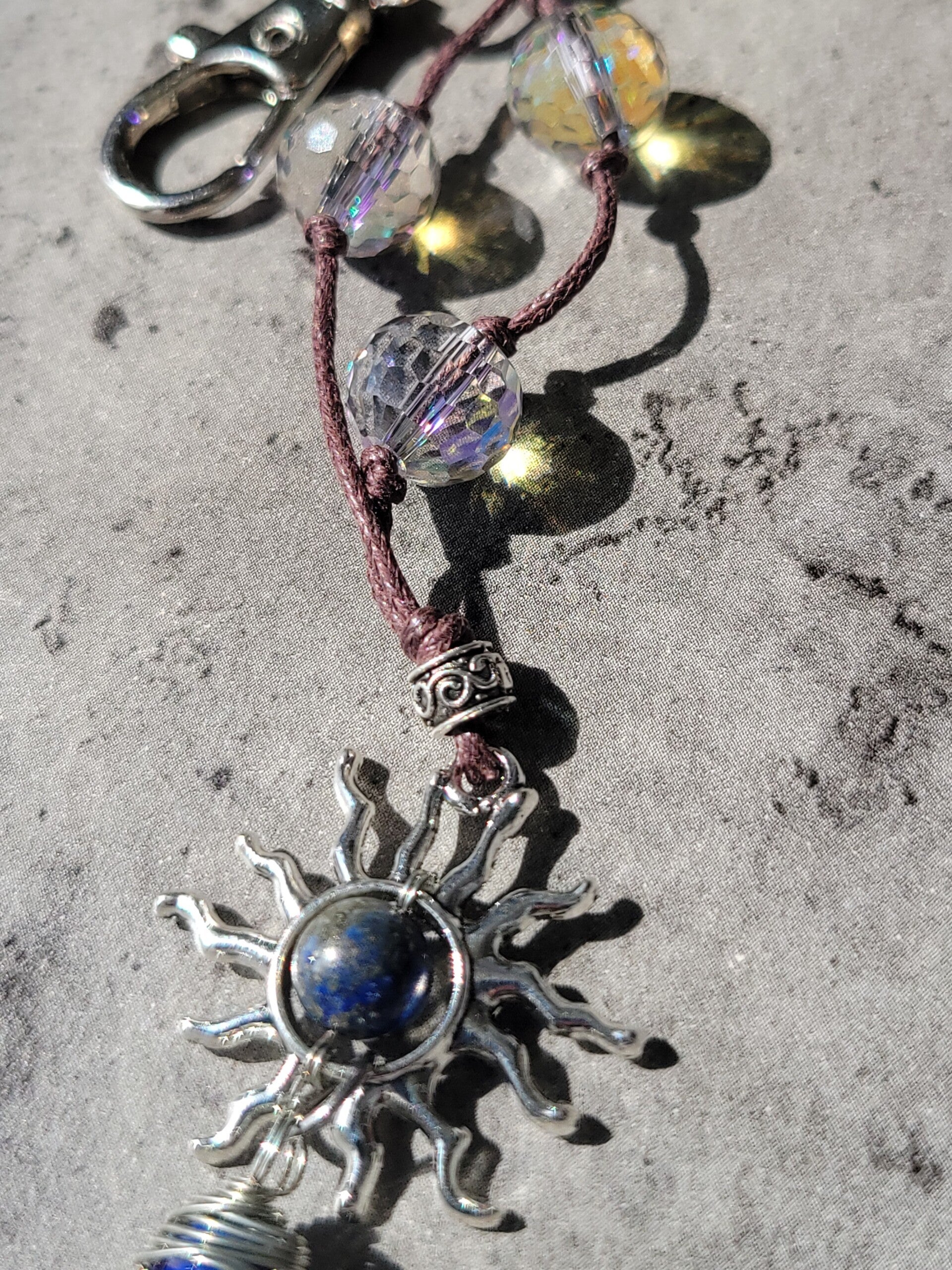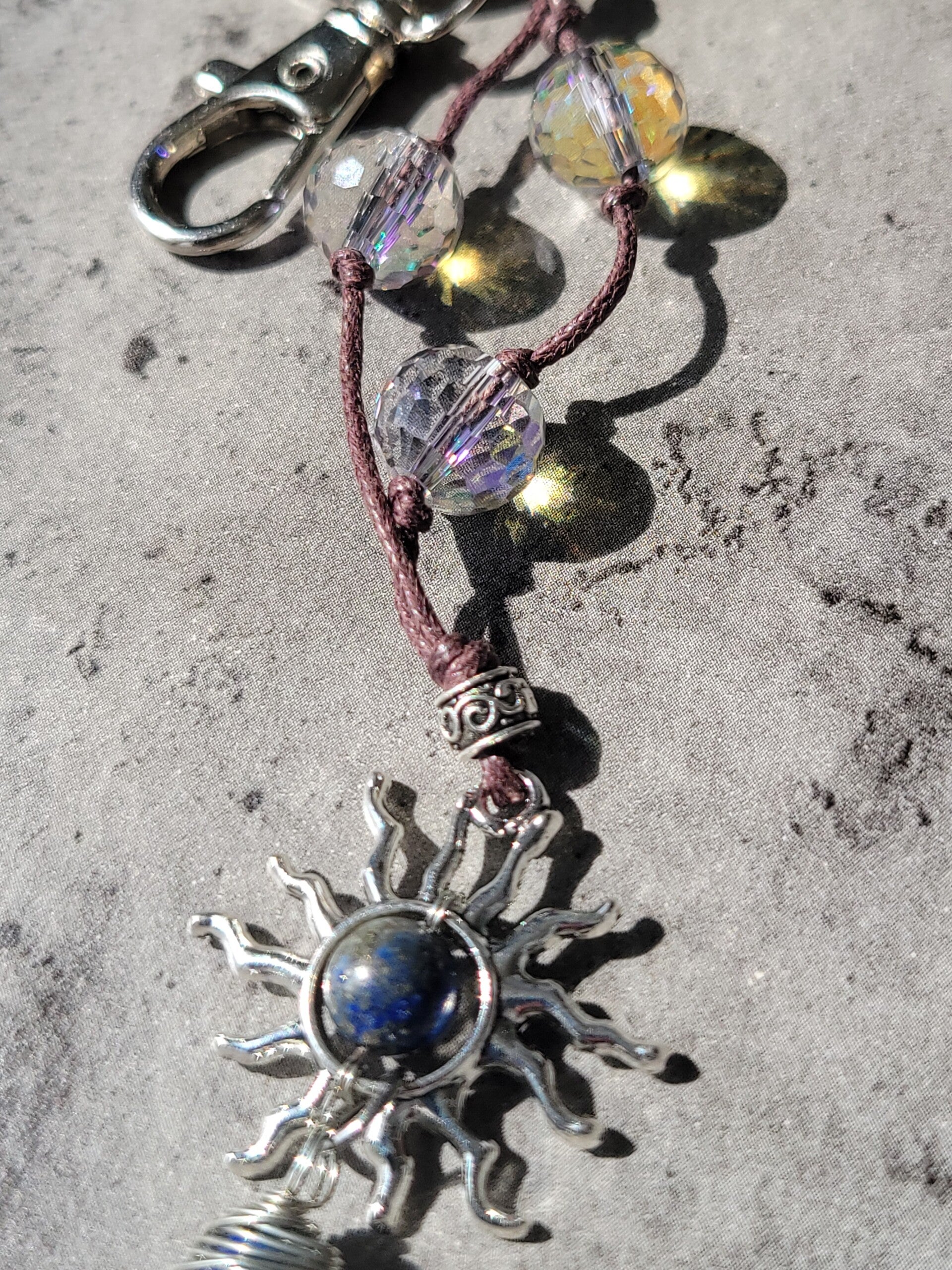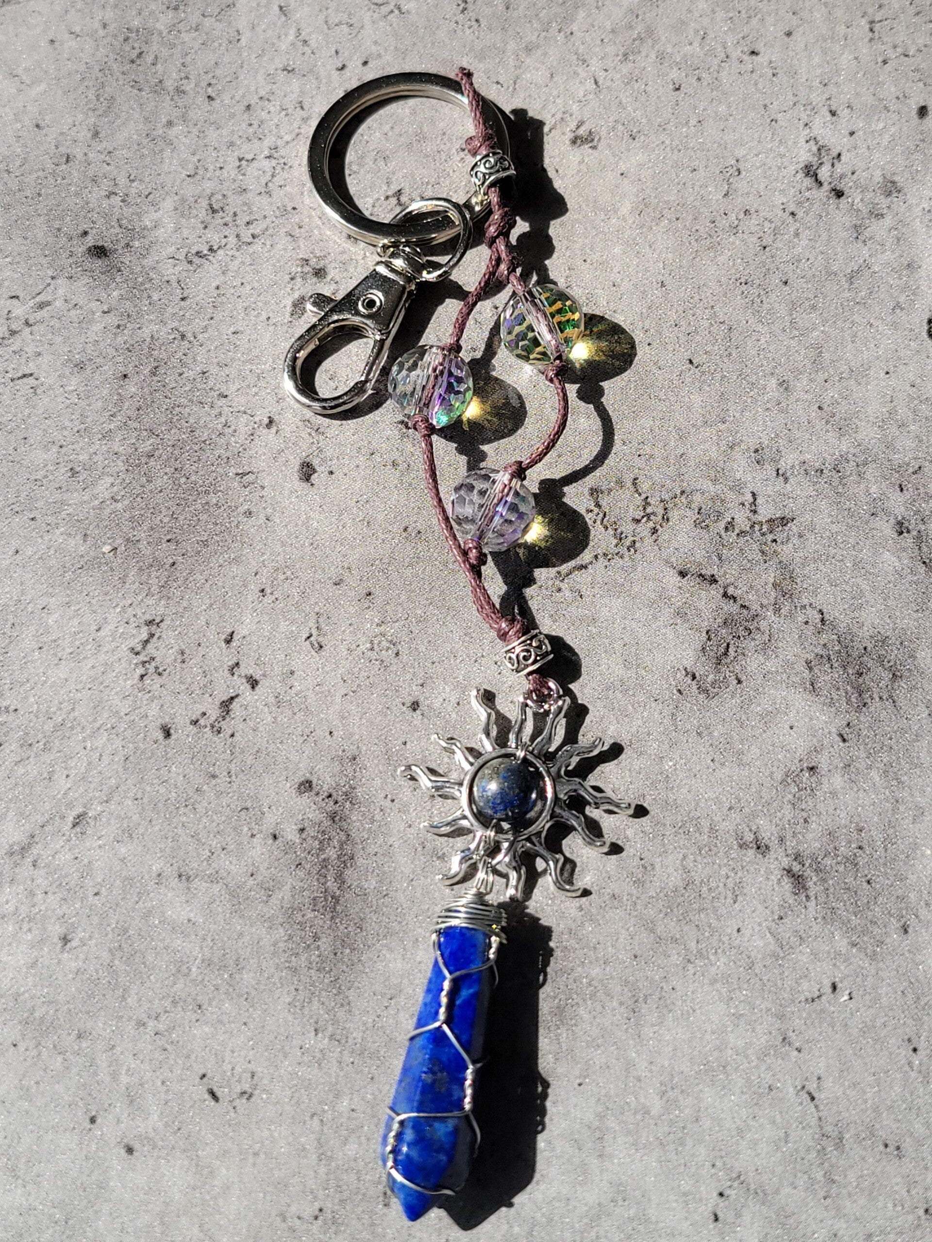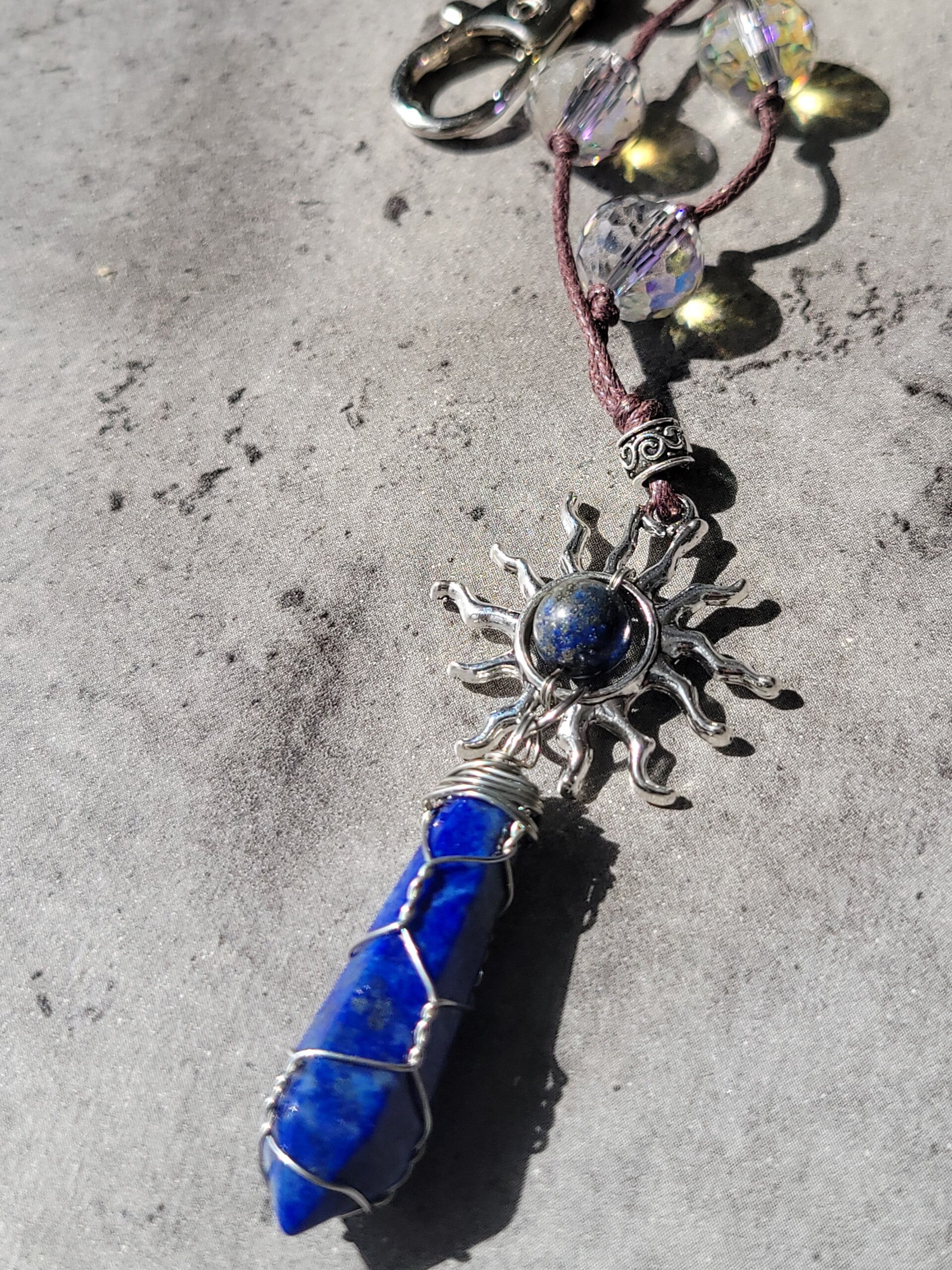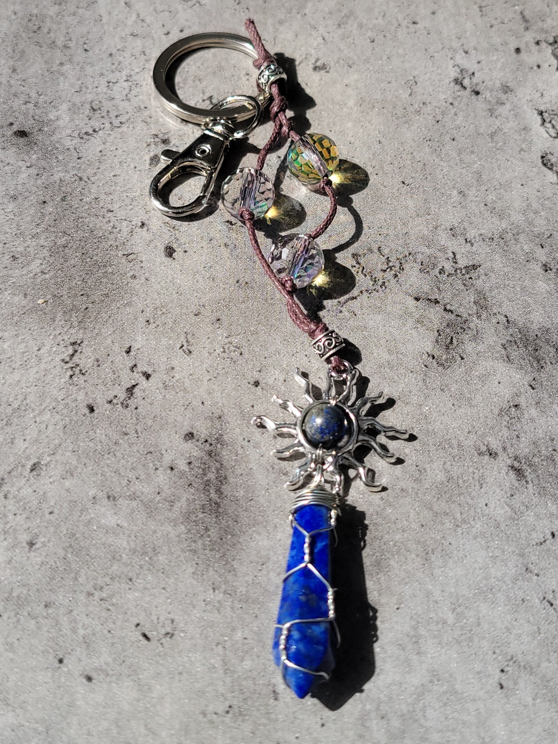 Blue crystal point keychain with sun charm and silver wire wrap details. A bold, celestial-inspired piece with a mystical, gothic touch—perfect for everyday magic.