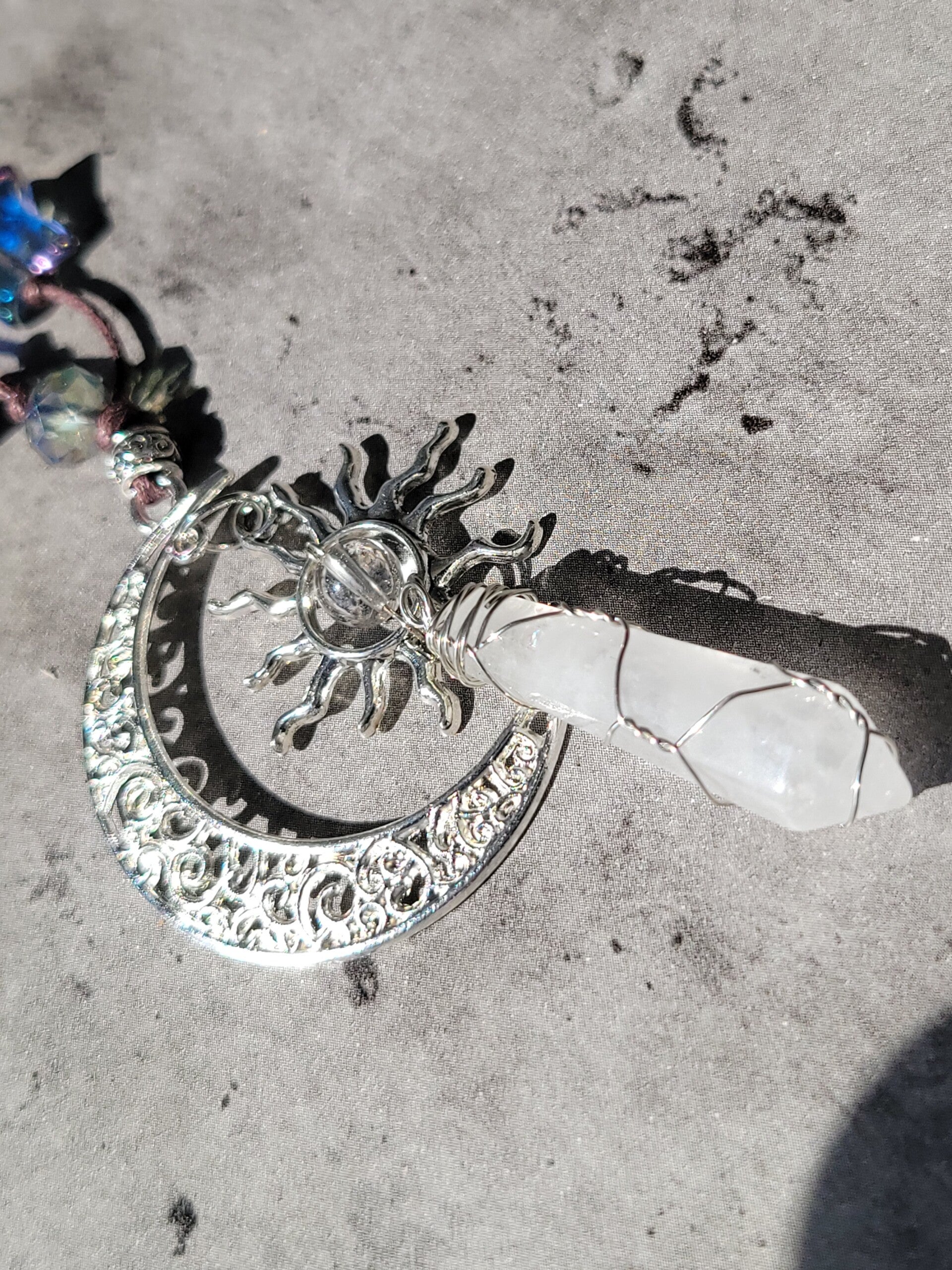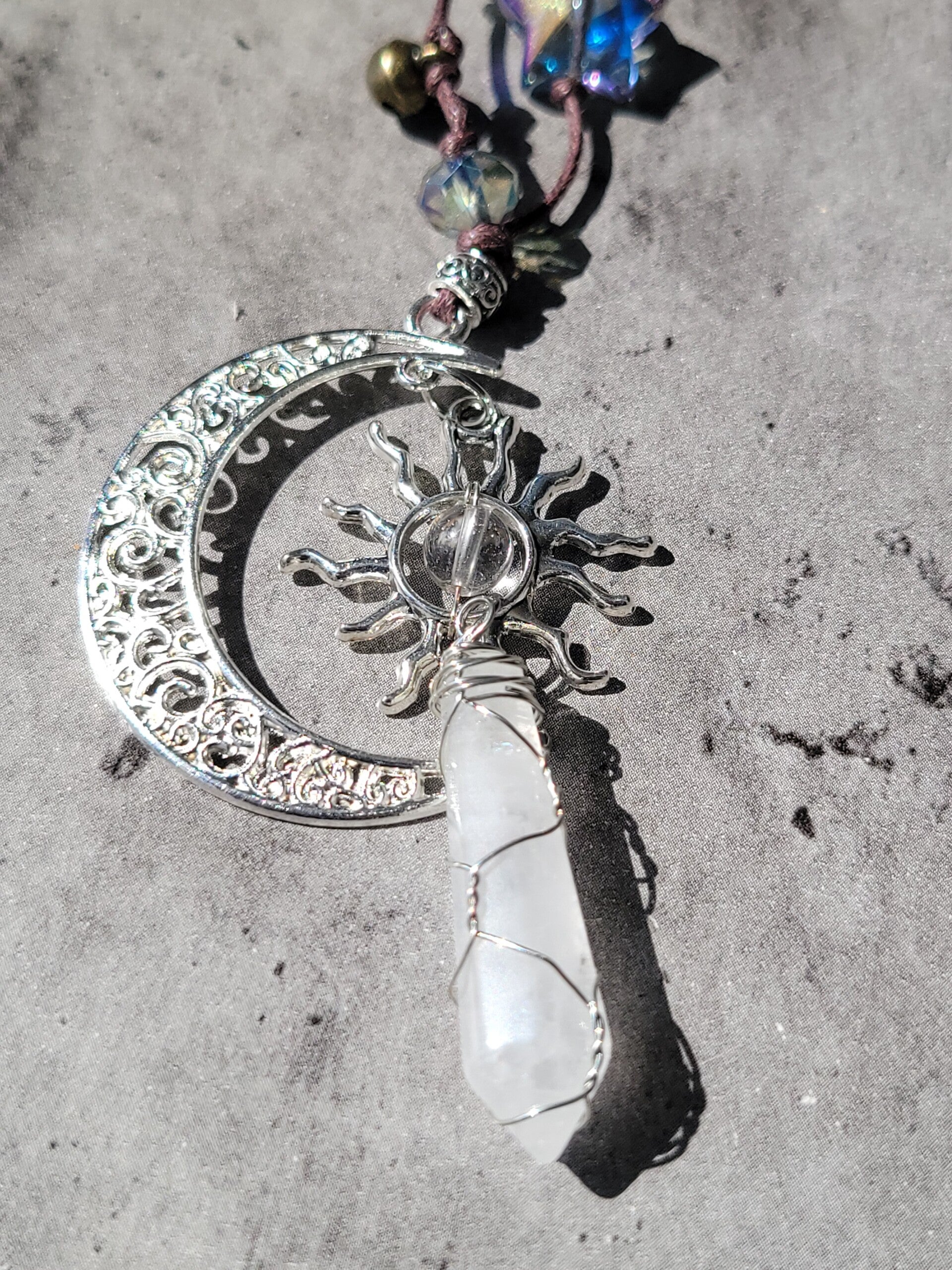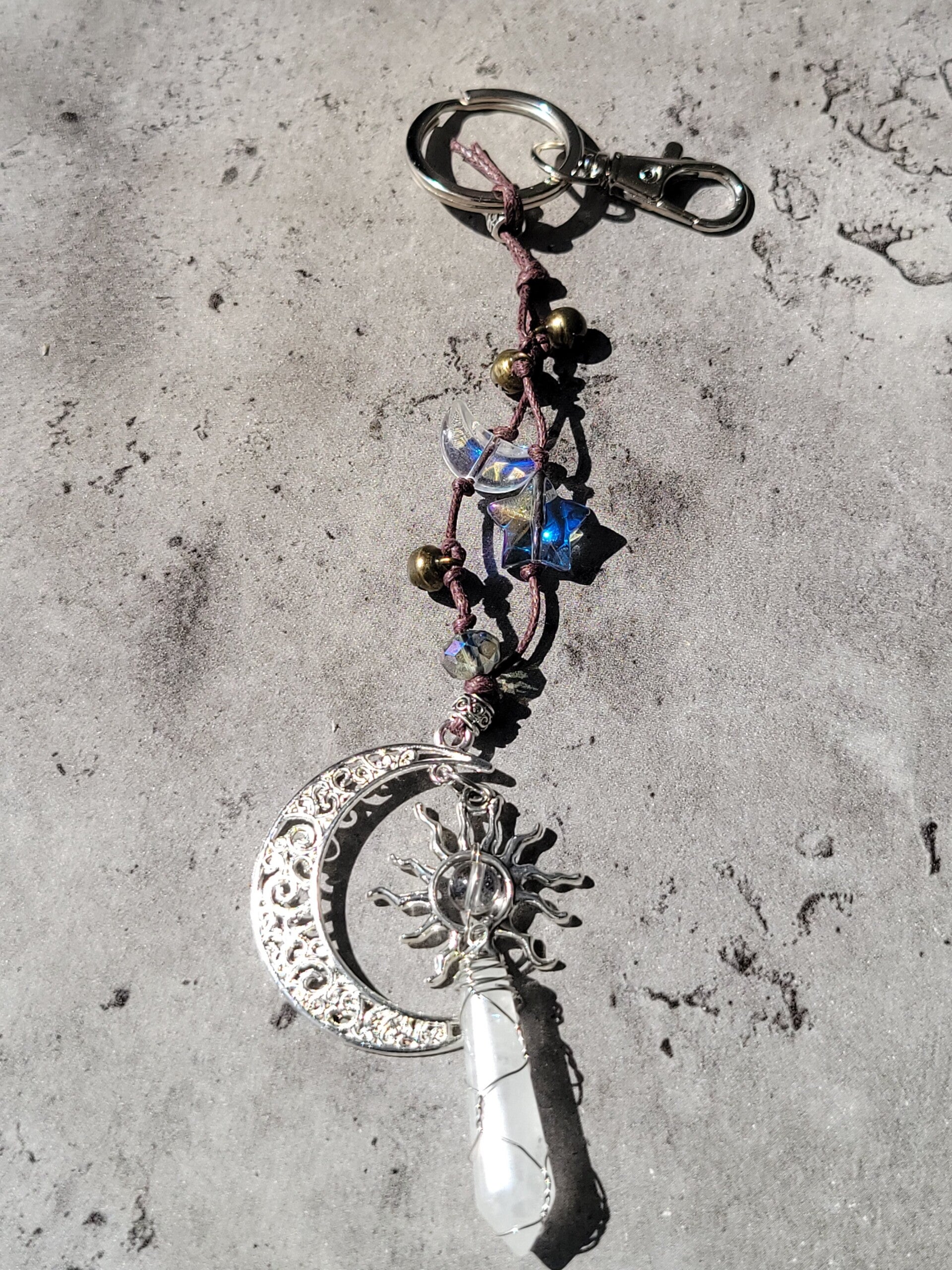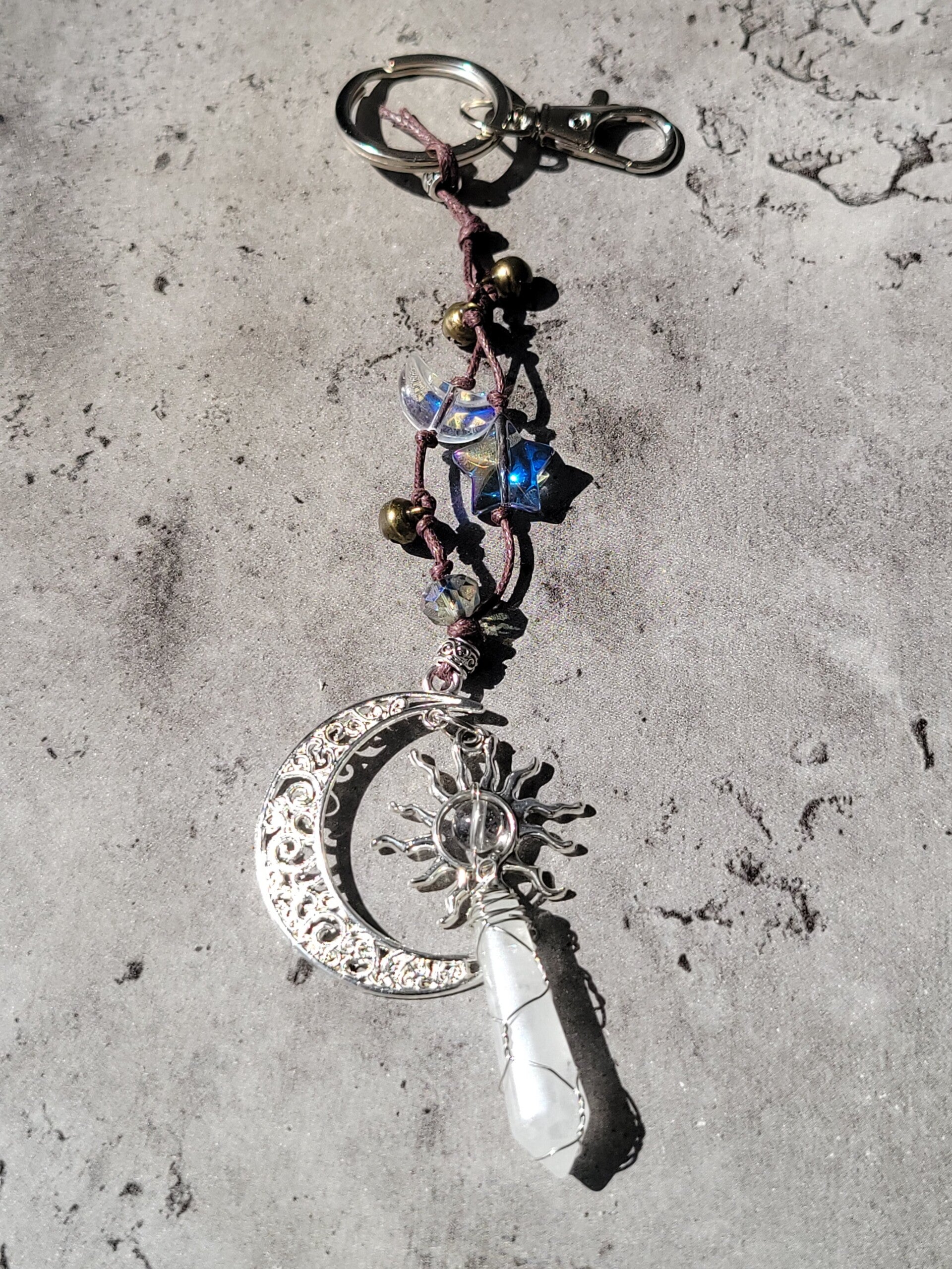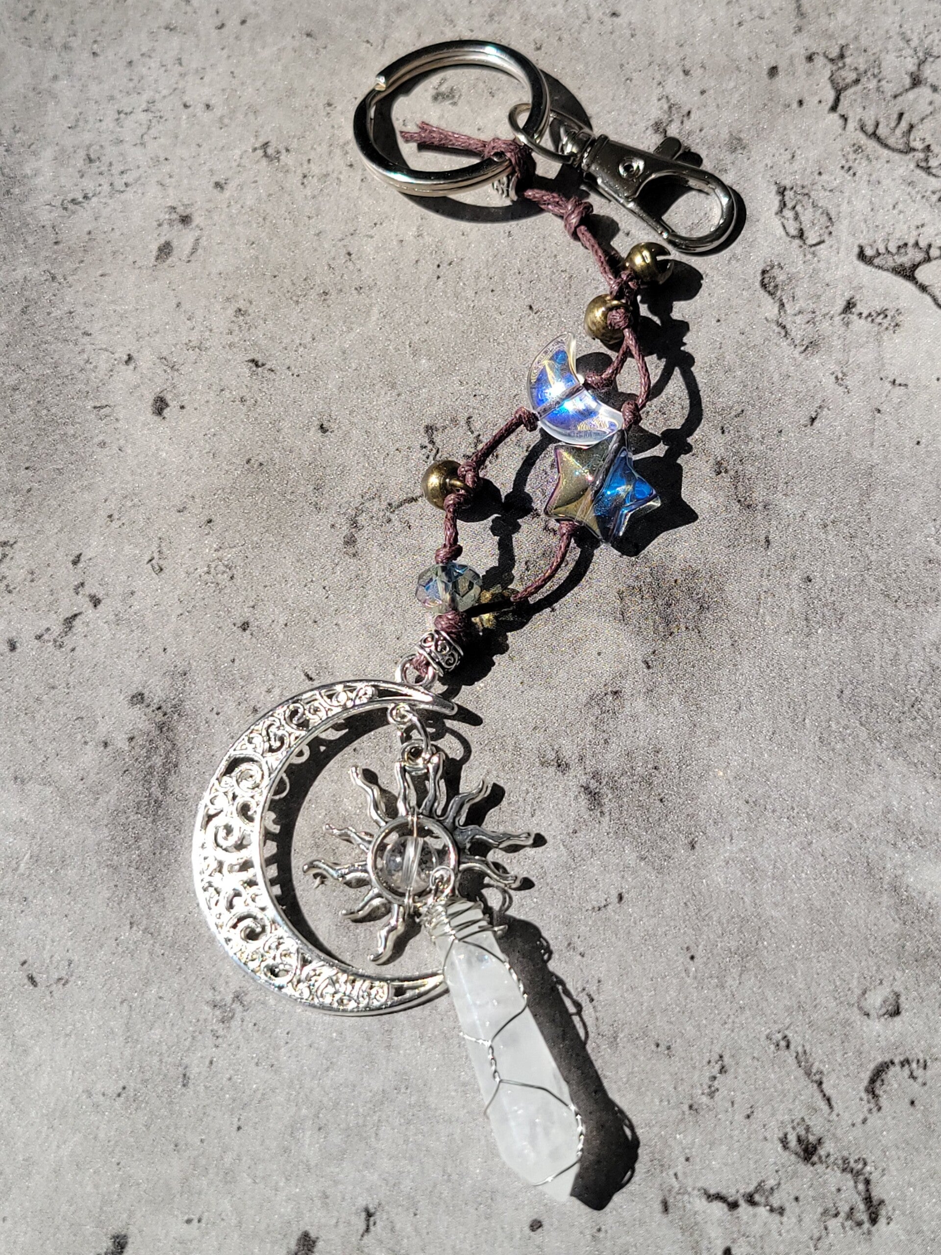Clear crystal keychain with crescent moon and sun charms, accented by iridescent star details. A dreamy celestial piece with a soft mystical glow—perfect for everyday magic.