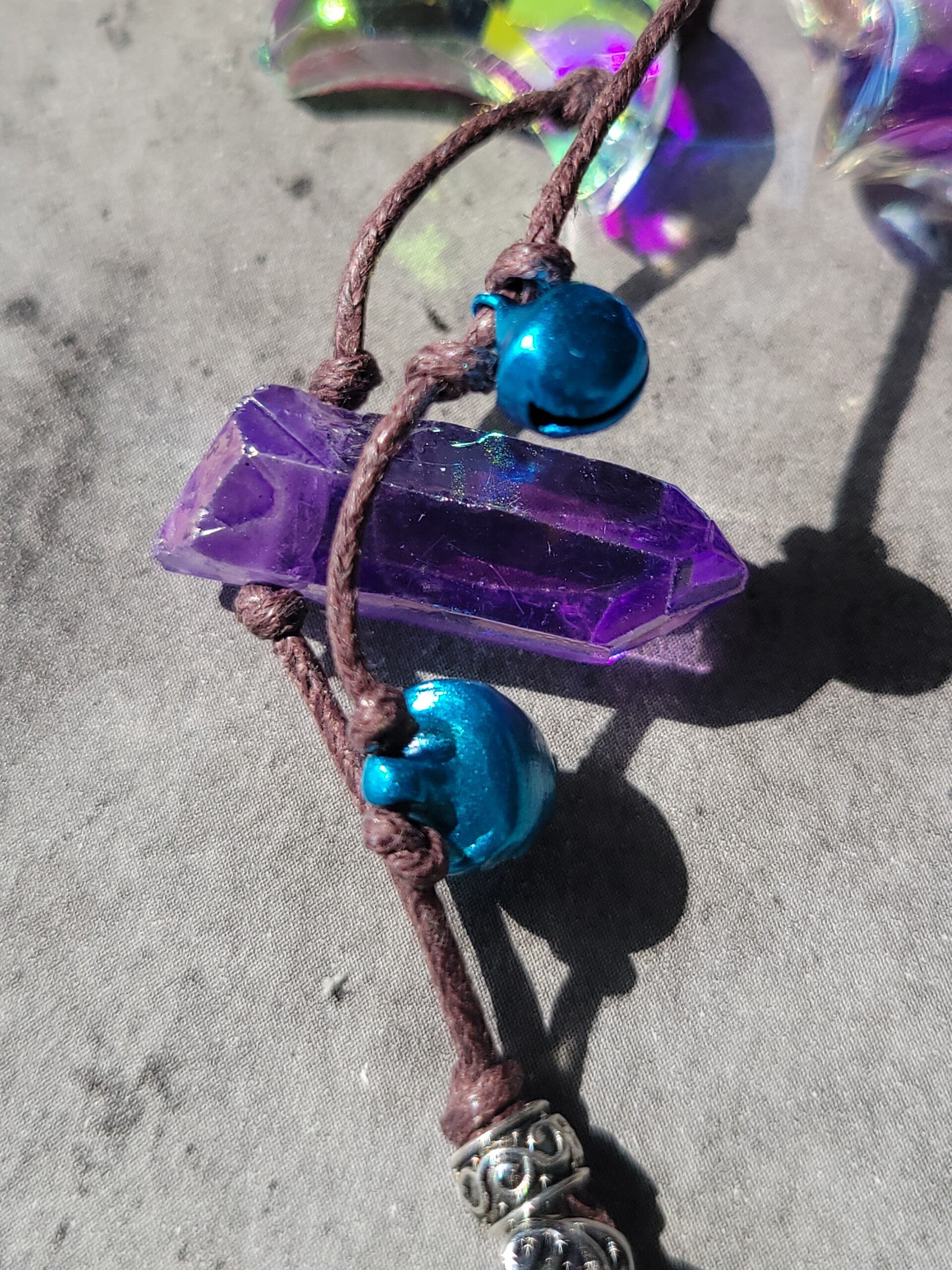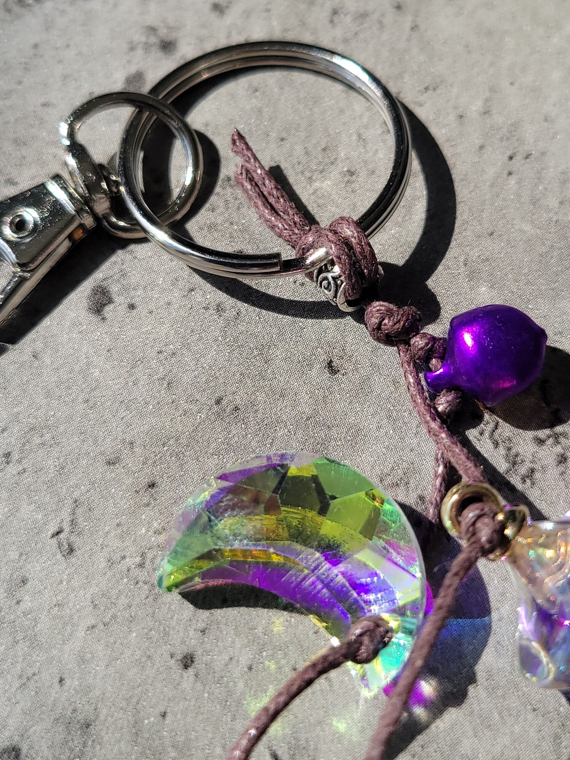 Amethyst crystal keychain with iridescent moon and star charms, accented by colourful bells. A dreamy, celestial piece with playful mystical vibes—perfect for adding a little magic to your keys or bag.