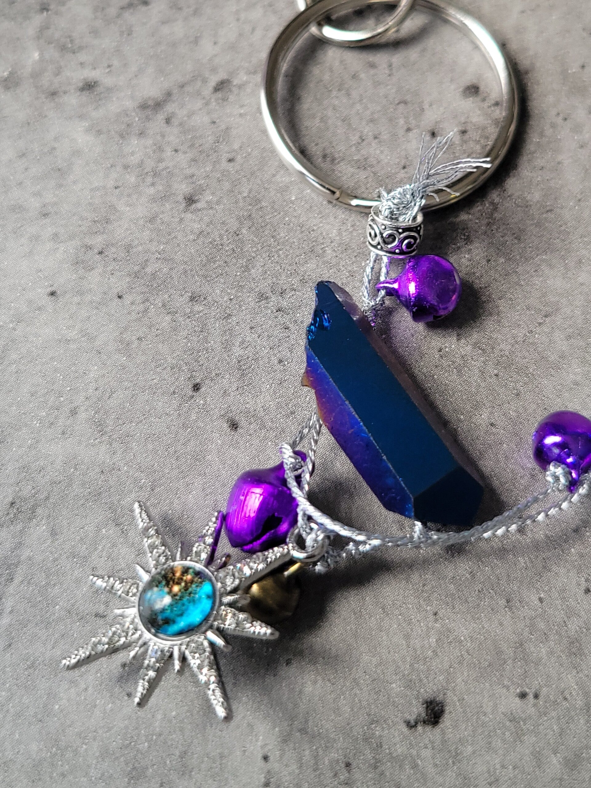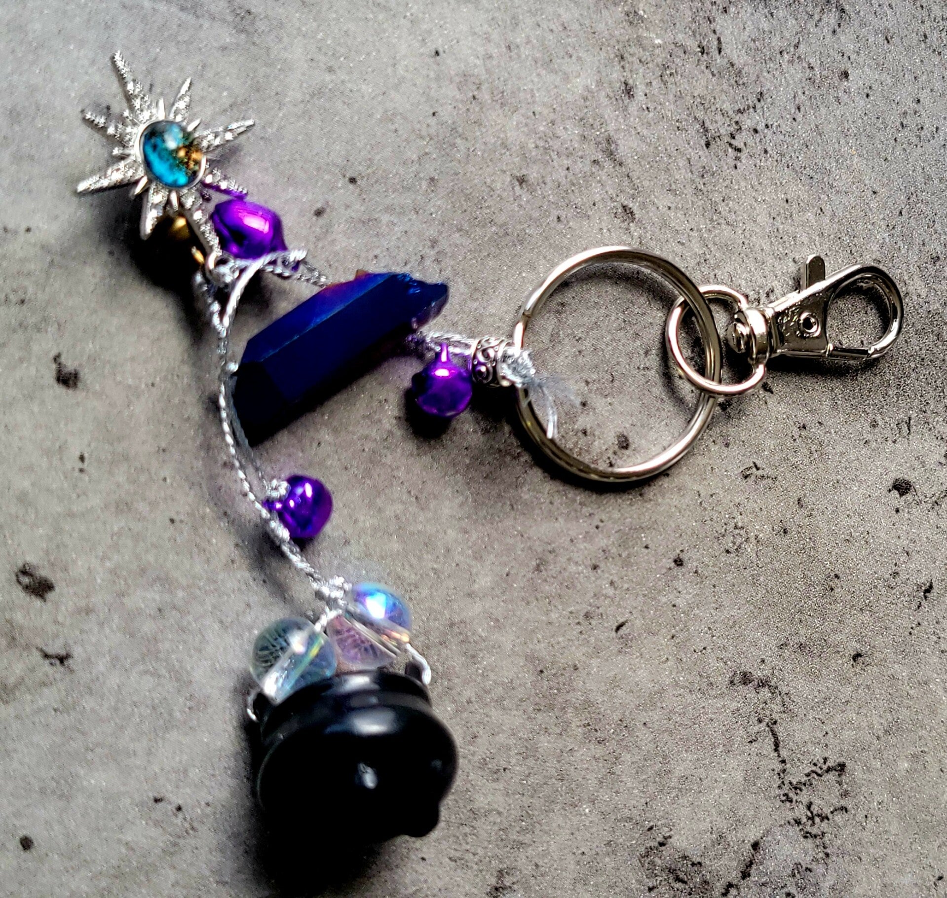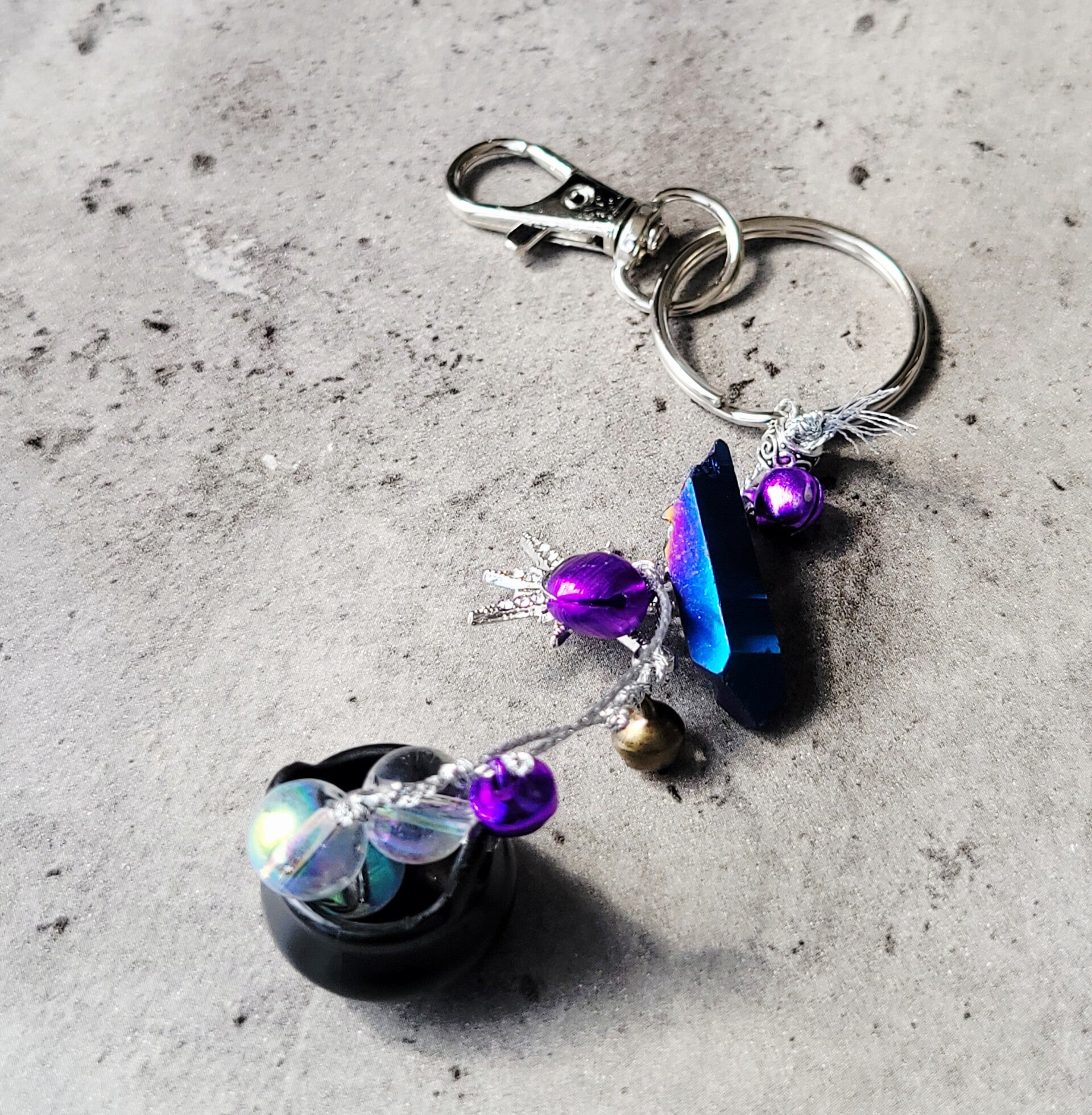 A playful little witchy keychain featuring a mini cauldron, shimmering iridescent bubbles, a deep blue crystal, and a sparkly star charm—popped with fun purple accents for a dash of magical mischief
